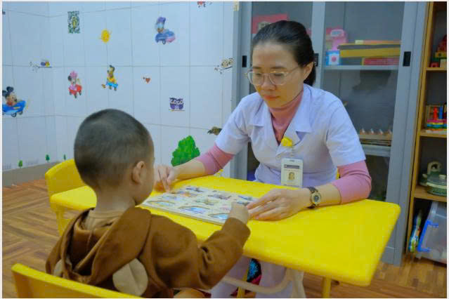 Trên chiếc ghế tập, bé Hồ Xuân Bắc (SN 2023) bị bại não bẩm sinh đang cố gắng nâng đầu theo hướng dẫn của bác sĩ. Cách đây hơn một tháng rưỡi, Bắc gần như không thể cử động, chỉ nằm một chỗ. Vậy mà giờ đây, em đã có thể ngồi dậy, cổ vận động được, mắt sáng lên khi thấy mẹ cười. Mẹ em, chị Hồ Thị Phương (SN 2004), xúc động chia sẻ: “Ngoài thời gian điều trị tại viện, các bác sĩ còn tận tình hướng dẫn tôi cách tập cho cháu ở nhà. Nhờ vậy, cháu tiến triển từng ngày. Thấy sự tiến bộ của con, tôi mừng rơi nước mắt”.