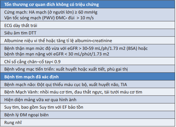- Đái tháo đường có tổn thương cơ quan đích ( như protein niệu) hay có kèm ≥ 1 nguy cơ tim mạch ( hút thuốc lá, THA hay rối loạn lipid máu).
