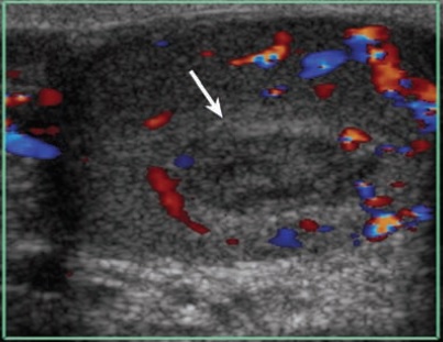 - Cấu trúc hồi âm không đồng nhất của tinh hoàn: cần 1 lực khoảng 50 kg mới có thể làm vỡ bao trắng tinh hoàn[2],[4],[6],[8]. Khi bao này vỡ thì hầu như nhu mô tinh hoàn bên dưới bị tổn thương do đó khi có dấu hiệu cấu trúc hồi âm không đồng nhất của tinh hoàn kèm với đường viền tinh hoàn không đều là có thể chẩn đoán vỡ tinh hoàn. Tuy nhiên với 1 lực nhỏ hơn chưa thể làm vỡ bao trắng nhưng cũng đủ làm đụng dập nhu mô tinh hoàn cho nên dấu hiệu cấu trúc hồi âm không đồng nhất của tinh hoàn một mình nó không đủ để chẩn đoán vỡ tinh hoàn trừ khi đi kèm với dấu hiệu vỡ bao trắng hay đường viền tinh hoàn không đều. Siêu âm có độ chính xác thấp trong chẩn đoán vỡ tinh hoàn nếu chỉ dựa vào dấu hiệu rách bao trắng với độ nhạy 50% và độ đặc hiệu 76%. Thêm các dấu hiệu như: cấu trúc hồi âm không đồng nhất và bất thường đường viền tinh hoàn đã được báo cáo là nâng độ nhạy và độ đặc hiệu của siêu âm trong chẩn đoán vỡ tinh hoàn lên 100% và 93,5% [2] - Mất tưới máu trong tinh hoàn: vỡ tinh hoàn sẽ làm mất tưới máu một phần hay toàn bộ tinh hoàn tùy mức độ thương tổn (Hình6).. Đây là một dấu hiệu rất quan trọng giúp đánh giá khả năng sống của nhu mô tinh hoàn và quyết định phương pháp phẫu thuật. Mất tưới máu 1 vùng trong tinh hoàn có thể là thứ phát sau tụ máu trong tinh hoàn (Hình7).. Nếu vùng thiếu tưới máu lớn có thể phải phẫu thuật lấy khối máu tụ.