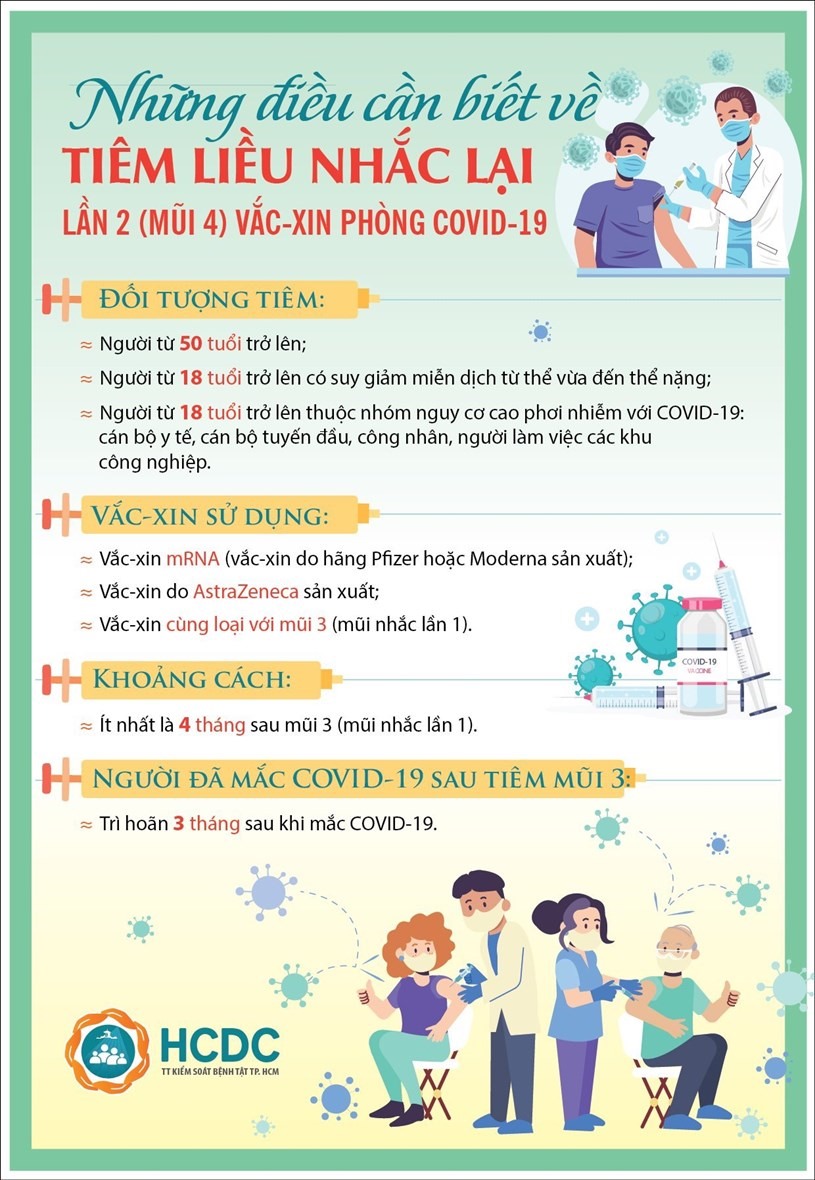 Để bảo vệ sức khỏe cho bản thân, gia đình và cả cộng đồng người dân cần chung tay thực hiện:- Tiếp tục thực hiện các biện pháp phòng, chống dịch như: rửa tay, đeo khẩu trang, …- Tham gia tiêm chủng phòng bệnh COVID-19 theo khuyến cáo của Bộ Y tế, tham gia tiêm phòng vắc xin COVID-19 mũi 3, mũi 4 để phòng các biến chủng mới.- Những đối tượng có nguy cơ cao cần đặc biệt chú ý là: người có bệnh nền, người trên 50 tuổi, phụ nữ có thai, kể cả người trên 18 tuổi chưa tiêm đủ vaccine phòng COVID-19.Những điều cần biết về tiêm liều nhắc lại lần 2 (mũi 4) vắc xin phòng COVID-19