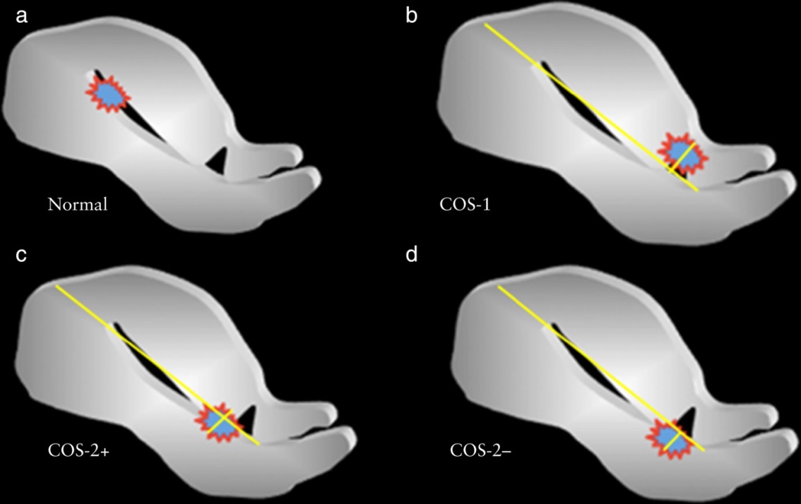 Hình 1: Giản đồ biểu thị tương quan giữa túi thai bám SMLT và thành trước tử cung, được định nghĩa dấu hiệu “Cross-over”. Ở mặt cắt dọc giữa tử cung, vẽ đường thẳng nối từ lỗ trong cổ tử cung đến đáy tử cung theo đường nội mạc tử cung (đoạn thẳng dài màu vàng). Xác định vị trí túi thai và vạch đường thẳng (đoạn thẳng màu vàng ngắn) theo hướng vuông góc với đường tiếp tuyến với lớp nội mạc tử cung. Phân loại các nhóm thai tùy thuộc vào mối tương quan giữa đường nội mạc và đường thẳng vuông góc với đường nội mạc đi qua túi thai: Nhóm thai bình thường: túi thai làm tổ cách xa sẹo mổ lấy thai và gần với đáy tử cung (a); COS-1: Túi thai định vị tại sẹo mổ lấy thai và ít nhất > 2/3 đường kính trước sau của túi thai nằm trên đường nội mạc, hướng về phía thành trước tử cung (b); COS - 2: túi thai định vị tại sẹo mổ mổ lấy thai và < 2/3 đường kính trước sau nằm trên đường nội mạc; COS-2+ có sự giao nhau của đường kính trước sau túi thai và đường nối nội mạc (c), COS-2- không sự giao nhau của đường kính trước sau túi thai và đường nối nội mạc (d).