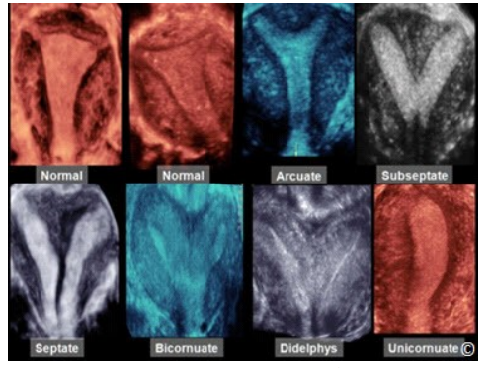 Hình 6: Phân loại hình ảnh tử cung bình thường và bất thường ở mặt phẳng giữa trán trên siêu âm 3D. Lưu ý hình ảnh rõ ràng của thanh mạc và nội mạc vùng đáy cũng như đoạn dưới tử cung giúp phân biệt các dị tật ống Muller khác nhau.