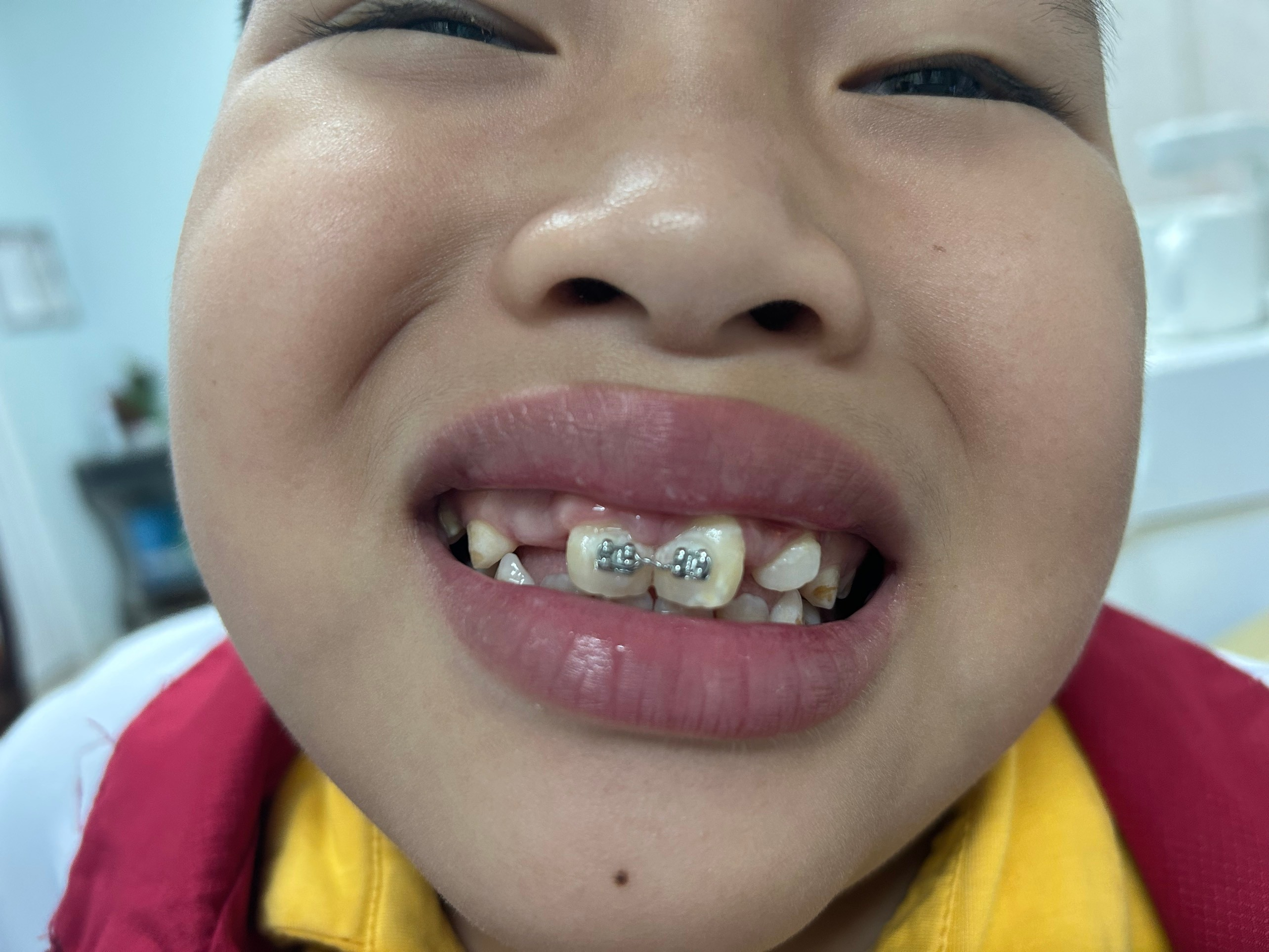 | R21 chưa mọc, R11 đã mọc (a), Răng thừa (b), R22 (c) | (b)Răng thừa thứ nhất, (a) răng thừa thứ 2, (c) R21 ngầm chưa mọc | Phẫu thuật lật vạt:(a) răng thừa thứ 1, (b) R21 ngầm, (c) R22 |