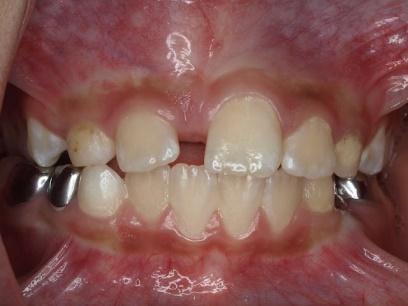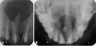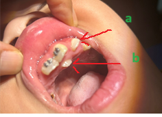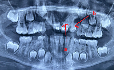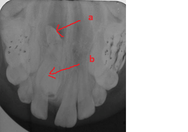 | Răng thừa làm cho R21 mọc thưa và lệch về phía môi | Răng thừa (a) làm R11 (b) bị kẹt không mọc ra được |