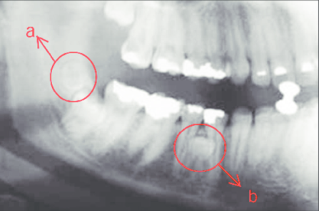 | Răng thừa (b) mọc trong vòm miệng khiến cho R22 (a) mọc lệch xoay trục | XQ răng toàn cảnh không thấy răng thừa do R21 (a) che khuất,(b) là R22 bị xoay trục |