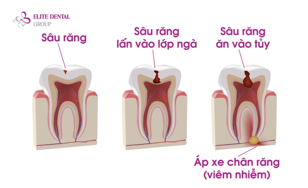 - Tổn thương sớm: Mới xuất hiện các vết đốm trắng đục trên bề mặt răng, ảnh hưởng đến lớp ngoài răng, màu sắc không thay đổi so vs những răng bên cạnh. Nên hướng dẫn vệ sinh răng miệng, tái khám định kỳ. - Sâu men răng: Hình thành lỗ ở men răng, sẽ chưa có cảm giác đau, đây là thời gian nên trám răng ngay. - Sâu ngà răng: Cảm giác ê buốt khi ăn đồ nóng lạnh, xuất hiện mùi hôi miệng, nên trám răng ngay. - Viêm tủy răng: Trẻ bị sâu răng ăn vào tủy gây đau dữ dội, cần điều trị tủy răng.