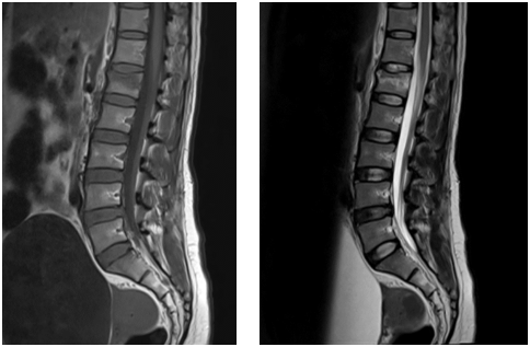 Hình chụp MRI cột sống thấy xẹp đốt sống L1 có phù mô xương xốp