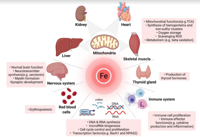 Sắt là một nguyên tố vi lượng thiết yếu, một đồng yếu tố cần thiết cho hoạt động bình thường của nhiều enzym tham gia vào các chức năng quan trọng của tế bào và cơ quan. Sắt là thành phần cấu tạo của hemoglobin và myoglobin quan trọng trong việc vận chuyển và lưu trữ oxy. Ngoài ra, sắt rất quan trọng đối với nhiều enzym và protein tham gia vào các quá trình trao đổi chất oxy hóa (ví dụ, chuỗi hô hấp ty thể, enzyme oxy hóa và bảo vệ chống lại stress oxy hóa), sinh tổng hợp mRNA, chức năng của tuyến giáp, hệ thần kinh trung ương và hệ thống miễn dịch. Hơn nữa, sắt đóng vai trò quan trọng trong quá trình tổng hợp và phân hủy protein, lipid (ví dụ, quá trình oxy hóa β của acid béo), cacbohydrat, DNA và RNA [6]. Sắt đặc biệt quan trọng đối với các tế bào có nhu cầu năng lượng cao (tế bào cơ tim, tế bào gan, tế bào thần kinh, thận và tế bào xương) hoặc hoạt động phân bào cao (ví dụ, tế bào tạo máu và tế bào miễn dịch). Vì vậy, các tế bào này nhạy cảm hơn với tình trạng thiếu sắt.