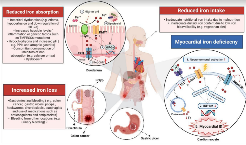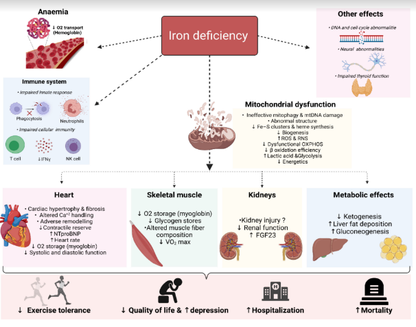 Hình 2. Tóm tắt hiểu biết hiện tại về các cơ chế cơ bản của tình trạng thiếu sắt trong suy tim [6]