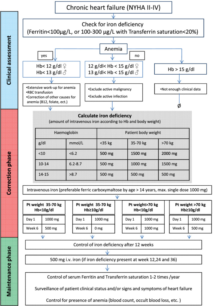 Liệuphápbổ sung sắtđườngtĩnhmạchvớiFericcarboxymaltosenênđượccânnhắc ở nhữngbệnhnhânsuytimcótriệuchứngvừamớinhậpviệnvìsuytimvà EF < 50% vàcótìnhtrạngthiếusắt ( Ferritinhuyếtthanh < 100 ng/ml hoặcFerritinhuyếtthanh 100-299 ng/ml và TSAT < 20% đểgiảmnguycơnhậpviện do suy tim.