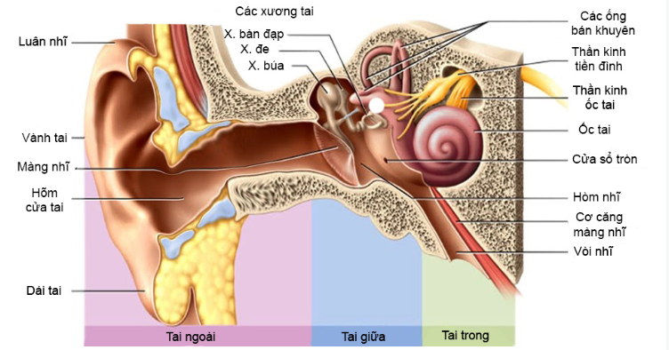 I. Đại cương - Tai là bộ phận quan trọng để tiếp nhận âm thanh trong không khí và đưa thông tin đến não bộ. Tai có thể phân biệt được âm thanh nhỏ, lớn, tiếng ồn, định hướng nguồn âm thanh và khoảng cách của nó. - Tai người gồm có 3 phần: Tai ngoài, tai giữa và tai trong