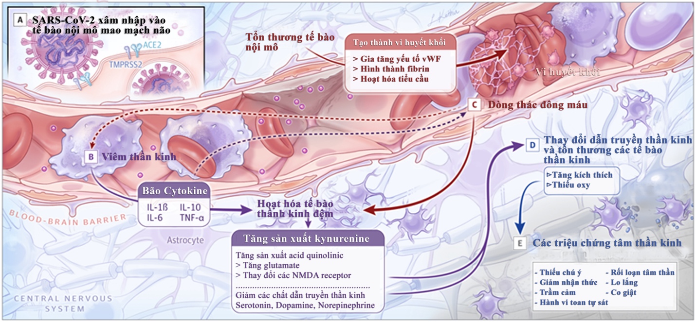 Chú thích: A, SARS-CoV-2 xâm nhập tế bào nội mô thông qua thụ thể men chuyển 2 (ACE2) xuyên màng, được kích hoạt bởi protease xuyên màng, serine 2 (TMPRSS2). B, Tăng cytokine và kích hoạt microglia (tế bào thần kinh đệm) dẫn đến tăng kynurenine, axit quinolinic và glutamate, và suy giảm chất dẫn truyền thần kinh. C, Dòng thác đông máu và sự gia tăng của yếu tố von Willebrand (vWF) dẫn đến các biến cố huyết khối. D, Sự dẫn truyền thần kinh bị thay đổi, sự kích thích do tăng glutamate, và tổn thương do thiếu oxy góp phần vào rối loạn chức năng và mất tế bào thần kinh. E, Các triệu chứng tâm thần kinh khác nhau tùy thuộc vào khu vực Brodmann liên quan. IL, interleukin; NMDA, N-metyl-d-aspartat; TNF, yếu tố hoại tử khối u.