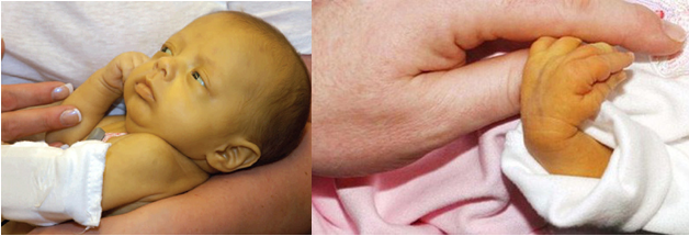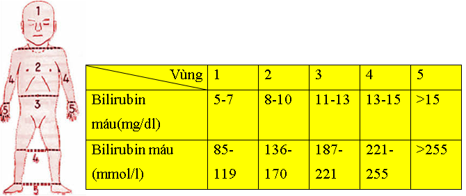 + Vàng da trong 24 giờ đầu. + Trẻ 2 ngày tuổi: vàng da đến cẳng chân, cẳng tay (nếu vàng da đến bàn chân, bàn tay: rất nặng). + Trẻ từ 3 ngày trở đi: Vàng da tới bàn tay, bàn chân. + Vàng da nhiều kèm triệu chứng thần kinh như bỏ bú, khóc thét, li bì, co giật…