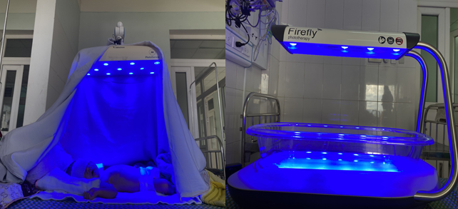 Ánh sáng trị liệu là ánh sáng xanh dương với bước sóng đặc biệt(420-460nm) chiếu trực tiếp vào da trẻ, cường độ ánh sáng 5-30uW/cm2/nm, khoảng cách từ đèn đến da trẻ là 30cm với đèn neon, 15cm với đèn led .